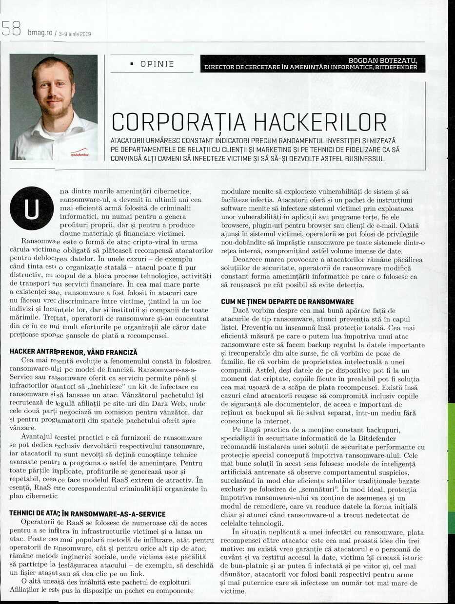 BOGDAN BOTEZATU, DIRECTOR DE CERCETARE ÎN AMENINȚĂRI INFORMATICE, BITDEFENDER 58 bmag.ro / 3-9 iunie 2019 OPINIE CORPORAȚIA HACKERILOR I ATACATORII URMĂRESC CONSTANT INDICATORI PRECUM RANDAMENTUL INVESTIȚIEI Șl MIZEAZĂ PE DEPARTAMENTELE DE RELAȚII CU CLIENȚII Șl MARKETING Șl PE TEHNICI DE FIDEUZARE CA SĂ CONVINGĂ ALTI OAMENI SĂ INFECTEZE VICTIME SI SĂ SĂ-SI DEZVOLTE ASTFEL BUSINESSUL.