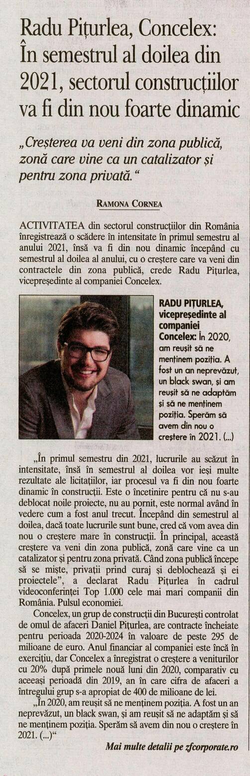 RADU PIȚURLEA, vicepreședinte al companiei Concelex: În 2020, am reușit să ne menținem poziția. A fost un an neprevăzut, un black swan, și am reușit să ne adaptăm și să ne menținem poziția. Sperăm să avem din nou o creștere în 2021. (...) 'în primul semestru din 2021, lucrurile au scăzut în intensitate, însă în semestrul al doilea vor ieși multe rezultate ale licitațiilor, iar procesul va fi din nou foarte dinamic în construcții. Este o încetinire pentru că nu s-au deblocat noile proiecte, nu au pornit, este normal având în vedere cum a fost anul trecut. începând din semestrul al doilea, dacă toate lucrurile sunt bune, cred că vom avea din nou o creștere mare în construcții. în principal, această creștere va veni din zona publică, zonă care vine ca un catalizator și pentru zona privată. Când zona publică începe să se miște, privații prind curaj și deblochează și ei proiectele', a declarat Radu Pițurlea în cadrul videoconferinței Top 1.000 cele mai mari companii din România. Pulsul economiei.