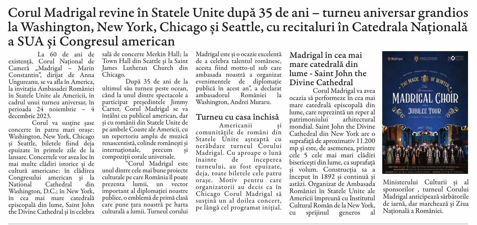 Corul Madrigal revine în Statele Unite după 35 de ani - turneu aniversar grandios la Washington, New York, Chicago și Seattle, cu recitaluri în Catedrala Națională a SUA și Congresul american La 60 de ani de existență, Corul Național de Cameră 'Madrigal - Marin Constantin', dirijat de Anna Ungureanu, se va afla în America, la invitația Ambasadei României în Statele Unite ale Americii, în cadrul unui turneu aniversar, în perioada 24 noiembrie - 4 decembrie 2023.