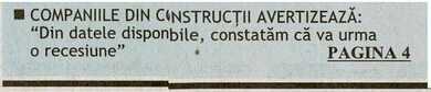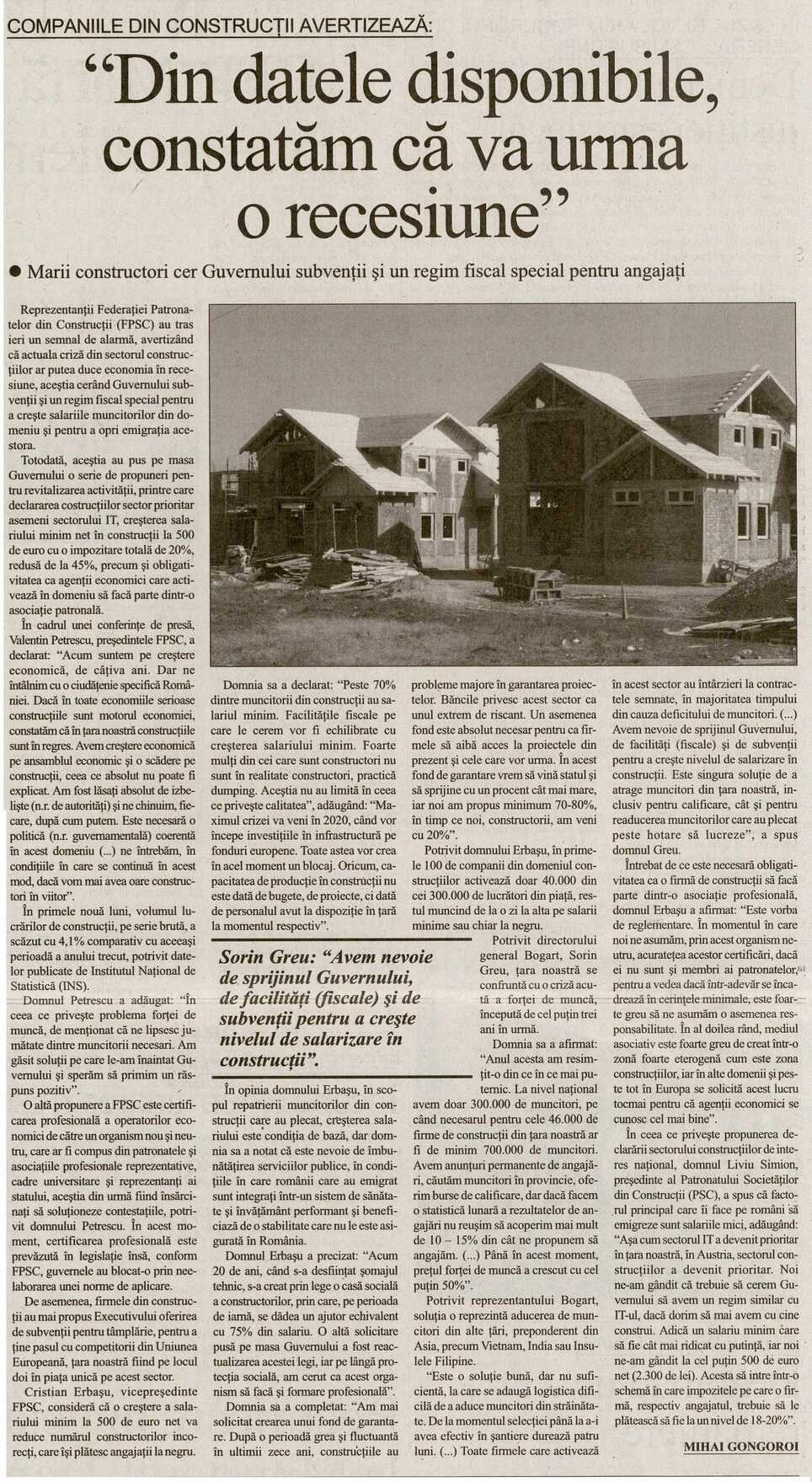 COMPANIILE DIN CONSTRUCTII AVERTIZEAZĂ: _i"Din datele disponibile, constatăm că va urma o recesiune" Marii constructori cer Guvernului subvenții și un regim fiscal special pentru angajați Reprezentanții Federației Patronatelor din Construcții (FPSC) au tras ieri un semnal de alarmă, avertizând că actuala criză din sectorul construcțiilor ar putea duce economia în recesiune, aceștia cerând Guvernului subvenții și un regim fiscal special pentru a crește salariile muncitorilor din domeniu și pentru a opri emigrația acestora.