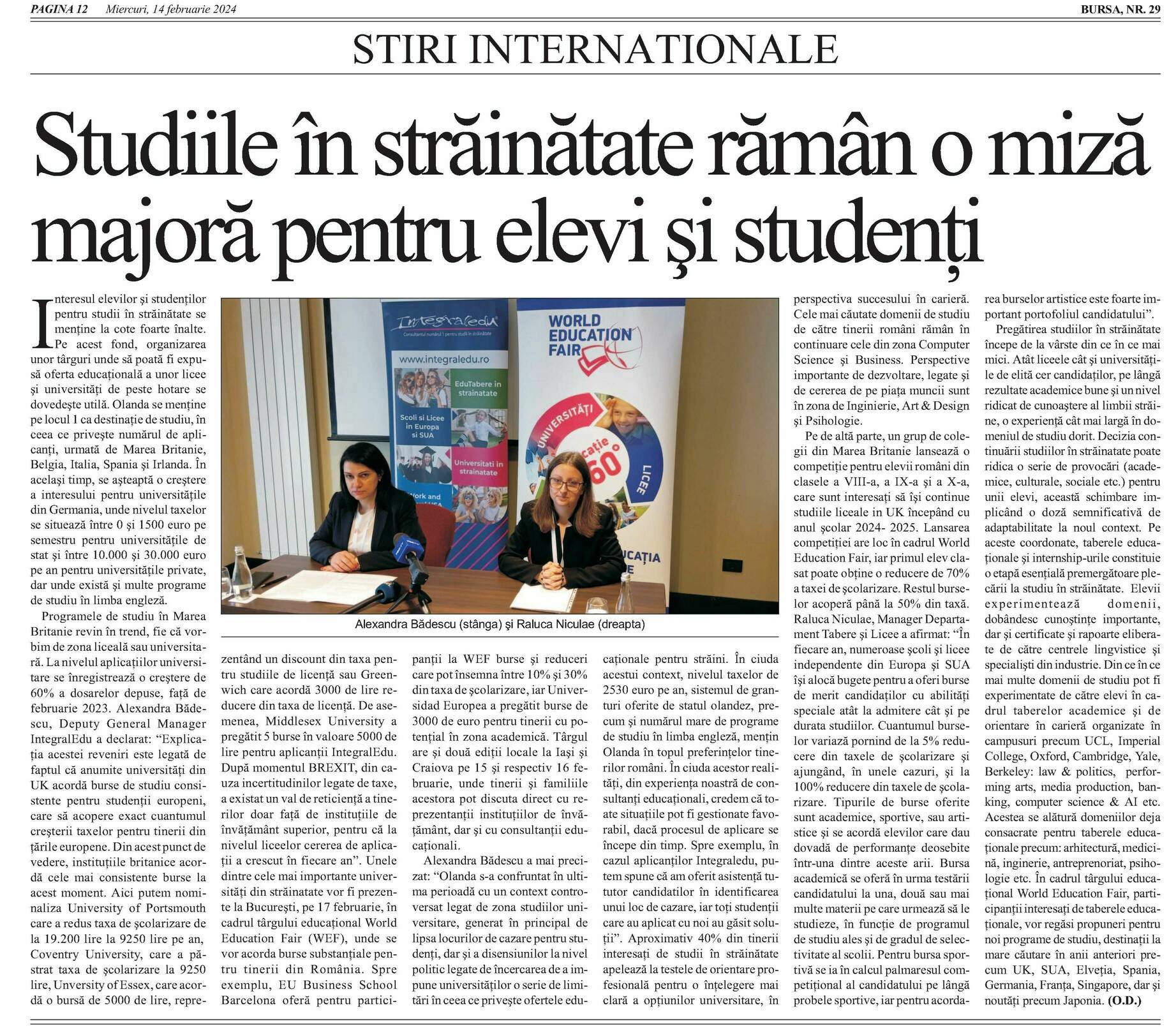 PAGINA 12 Miercuri, 14februarie 2024 BURSA, NR. 29 _ȘTIRI INTERNATIONALE_ Studiile în străinătate rămân o miză majoră pentru elevi și studenti Alexandra Badescu (stanga) și Raluca Niculae (dreapta! Interesul elevilor și studenților pentru studii în străinătate se menține la cote foarte înalte.