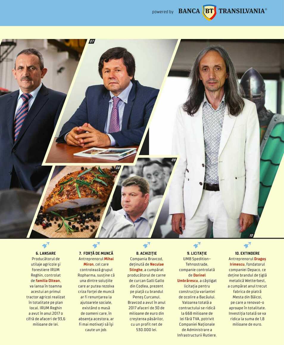 6. LANSARE Producătorul de utilaje agricole și Forestiere IRUM Reghin, controlat de Familia Oltean, va lansa în toamna acestui an primul tractoragricol realizat în totalitate pe plan local. IRUM Reghin a avut în anul 2017 o ciFră de afaceri de 93,6 milioane de lei.