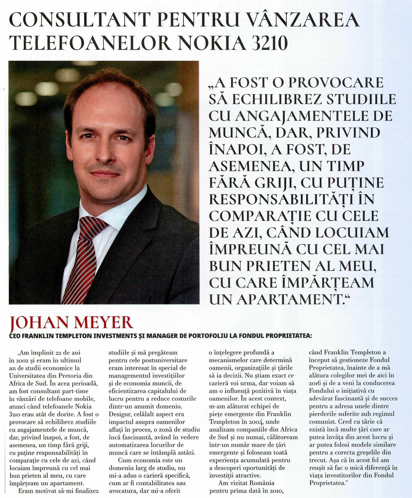 CONSULTANT PENTRU VÂNZAREA TELEFOANELOR NOKIA 3210 'A FOST O PROVOCARE SĂ ECHILIBREZ STUDIILE CU ANGAJAMENTELE DE MUNCĂ, DAR, PRIVIND ÎNAPOI, A FOST, DE ASEMENEA, UN TIMP FĂRĂ GRIJI, CU PUȚINE RESPONSABILITĂȚI ÎN COMPARAȚIE CU CELE DE AZI, CĂND LOCUIAM ÎMPREUNĂ CU CEL MAI BUN PRIETEN AL MEU, CU CARE ÎMPĂRȚEAM UN APARTAMENT.' JOHAN MEYER CEO FRANKLIN TEMPLETON INVESTMENTS SI MANAGER DE PORTOFOLIU LA FONDUL PROPRIETATEA: 'Am împlinit 22 de ani în 2002 și eram în ultimul an de studii economice la Universitatea din Pretoria din Africa de Sud. In acea perioadă, am fost consultant part-time în vânzări de telefoane mobile, atunci când telefoanele Nokia 3210 erau atât de dorite. A fost o provocare să echilibrez studiile cu angajamentele de muncă, dar, privind înapoi, a fost, de asemenea, un timp fără griji, cu puține responsabilități în comparație cu cele de azi, când locuiam împreună cu cel mai bun prieten al meu, cu care împărțeam un apartament.