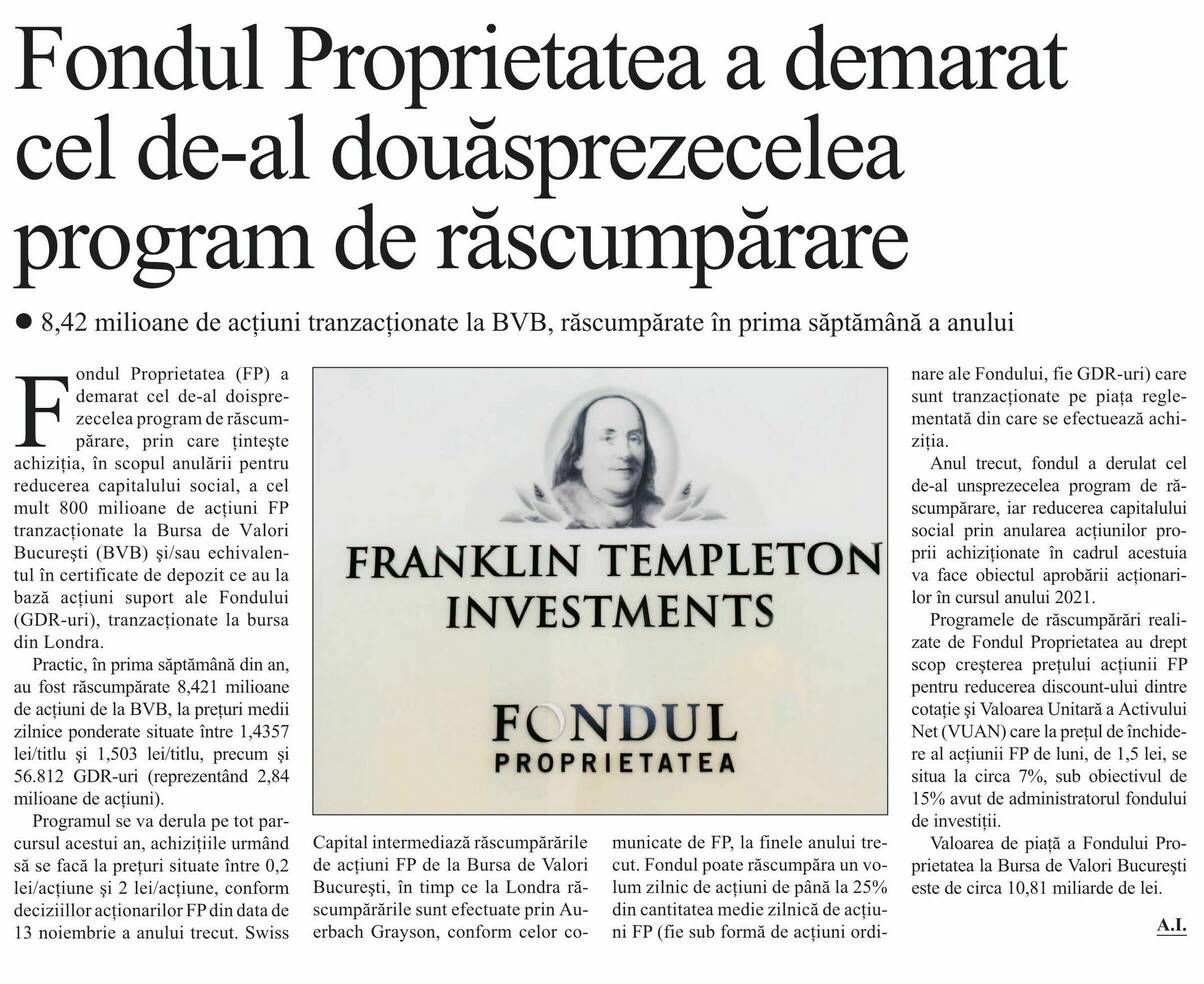 Fondul Proprietatea a demarat cel de-al douăsprezecelea program de răscumpărare 8,42 milioane de acțiuni tranzacționate la BVB, răscumpărate în prima săptămână a anului FRANKLIN TEMPLETON INVESTMENTS FCNDUL PROPRI ETATEA Fondul Proprietatea (FP) a demarat cel de-al doisprezecelea program de răscumpărare, prin care țintește achiziția, în scopul anulării pentru reducerea capitalului social, a cel mult 800 milioane de acțiuni FP tranzacționate la Bursa de Valori București (BVB) și/sau echivalentul în certificate de depozit ce au la bază acțiuni suport ale Fondului (GDR-uri), tranzacționate la bursa din Londra.